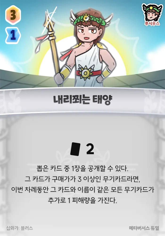 +2 카드, 뽑은 카드 중 1장을 공개할 수 있다. 그 카드가 구매가가 3 이상인 무기카드라면, 이번 차례동안 그 카드와 이름이 같은 모든 무기카드가 추가로 1 피해량을 가진다.