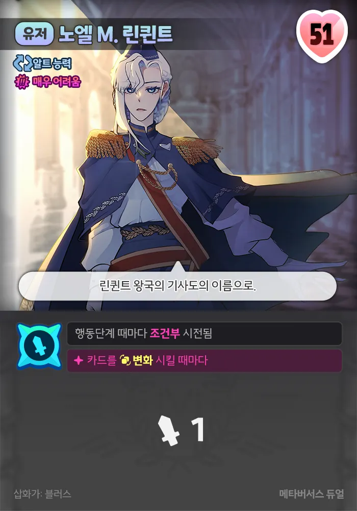 상대의 뽑기 덱에서 카드 1장을 공개하고 버린다. 그 카드가 “단검”이라면 추가로 +1 행동력, 5 피해 피해를 줬다면 이 카드를 “가문간의 불화” 1장으로