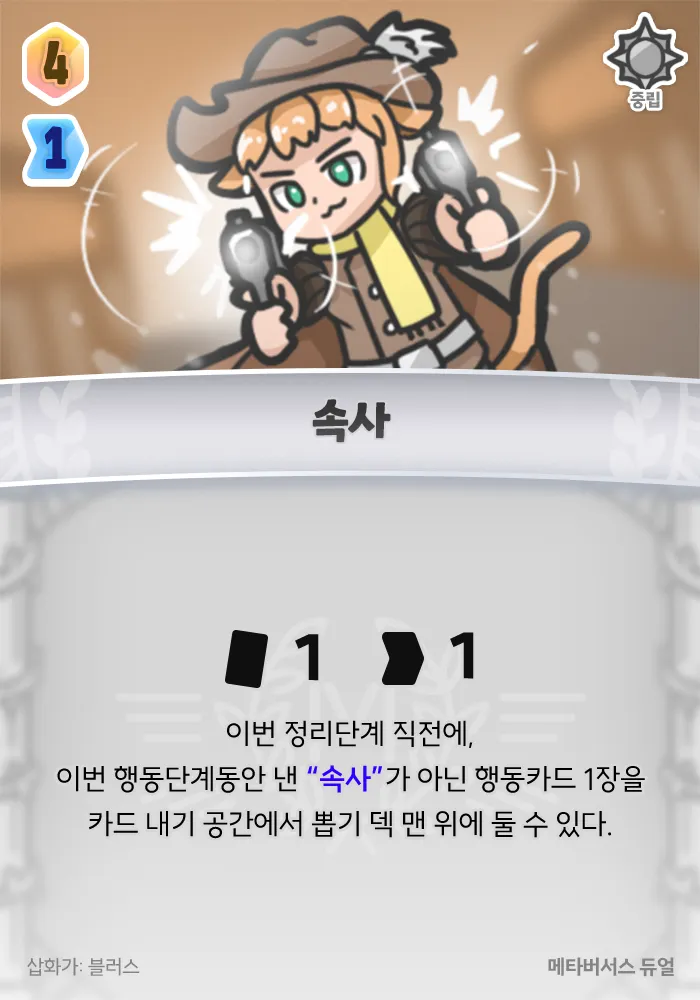 +1 카드, +1 행동력, 이번 정리단계 직전에, 이번 행동단계동안 낸 “속사”가 아닌 행동카드 1장을 카드 내기 공간에서 뽑기 덱 맨 위에 둘 수 있다.