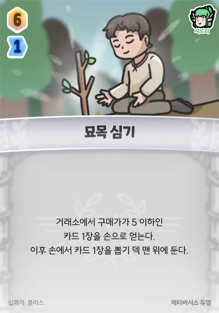 거래소에서 구매가가 5 이하인 카드 1장을 손으로 얻는다. 이후 손에서 카드 1장을 뽑기 덱 맨 위에 둔다.