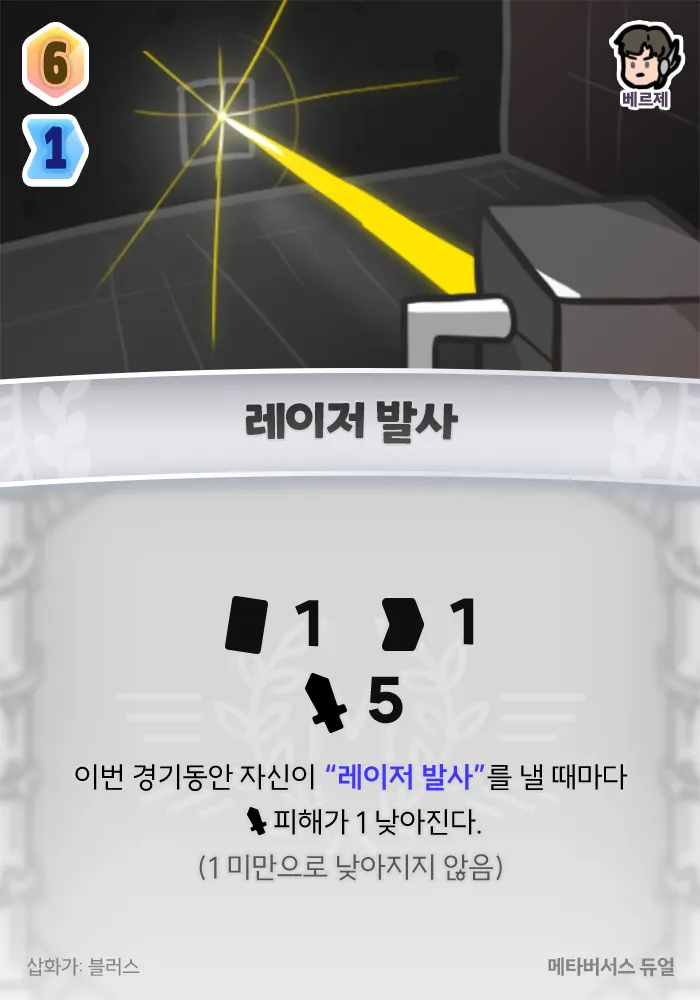 +1 카드, +1 행동력, 5 피해 이번 경기동안 자신이 “레이저 발사”를 낼 때마다 피해가 1 낮아진다. (1 미만으로 낮아지지 않음)