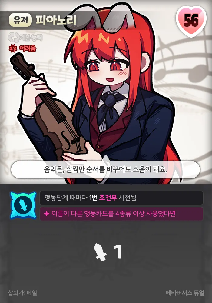 마무리 : 행동단계동안, 이 카드를 내기 직전에 마무리 효과를 시전하겠다고 선언하면 제시된 추가 효과가 시전됩니다. 그 추가 효과를 시전했다면, 이번 행동단계동안 행동카드를 낼 수 없게 됩니다.추천 조합