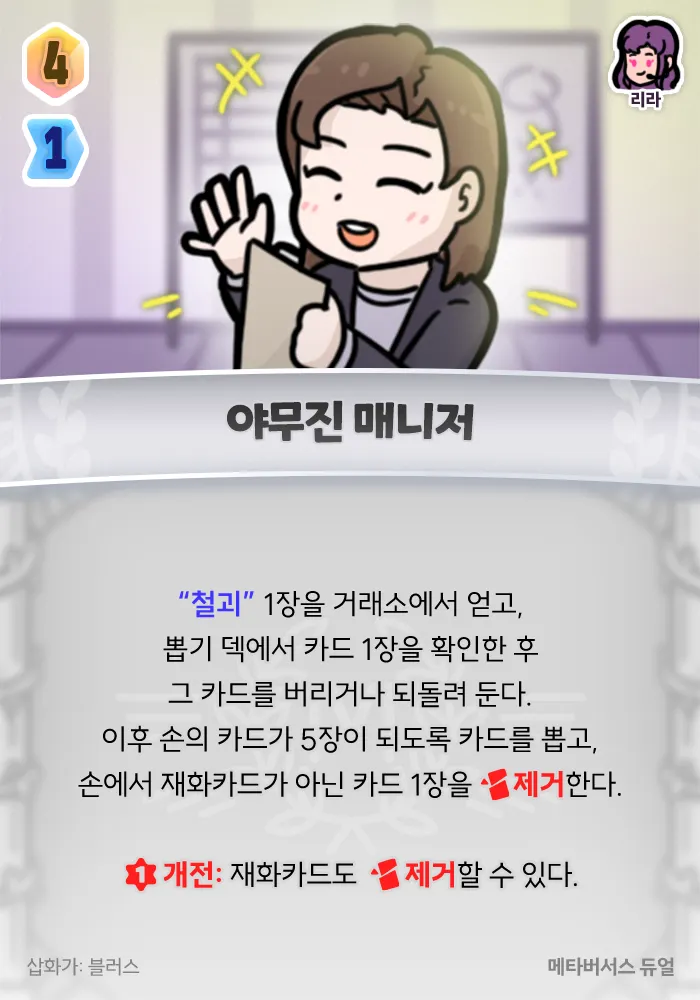 “철괴” 1장을 거래소에서 얻고, 뽑기 덱에서 카드 1장을 확인한 후 그 카드를 버리거나 되돌려 둔다. 이후 손의 카드가 5장이 되도록 카드를 뽑고, 손에서 재화카드가 아닌 카드 1장을