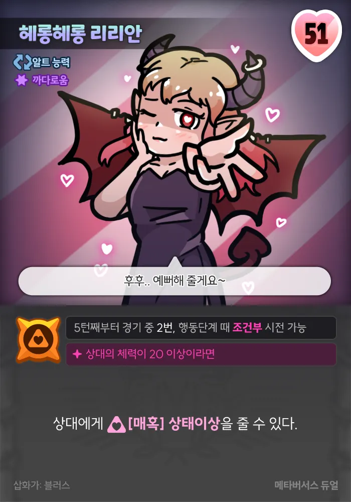 [매혹] 상태이상 : 공격단계 때 손의 모든 카드를 버린 후, 버린 카드 1장당 1 피해를 입습니다. 차례를 마치면 상태이상을 해제합니다.추천 조합