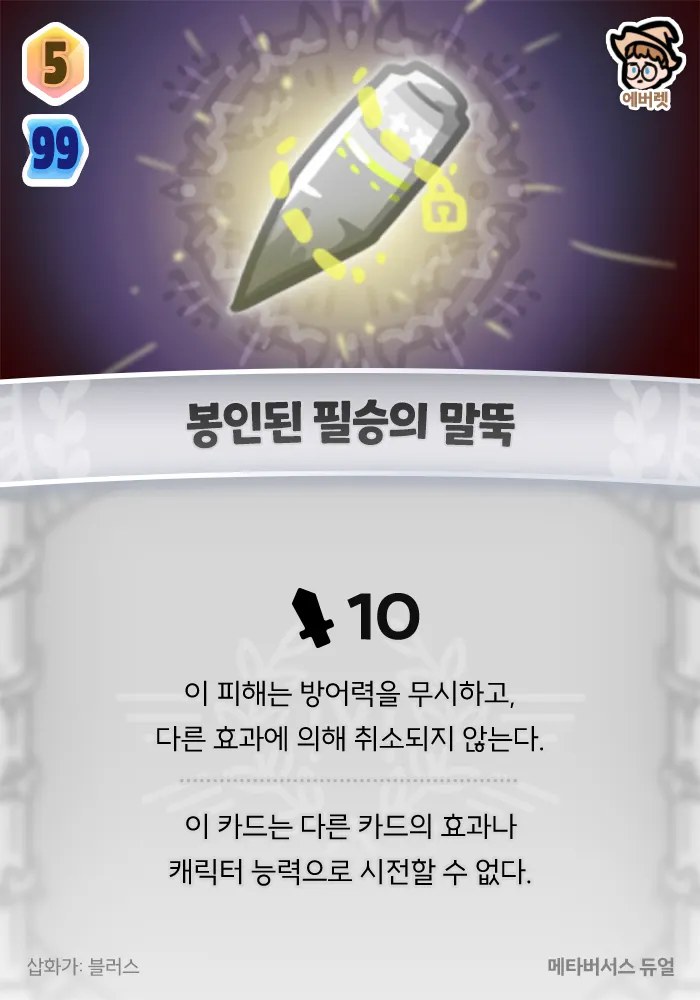 10 피해, 이 피해는 방어력을 무시하고, 다른 효과에 의해 취소되지 않는다. 이 카드는 다른 카드의 효과나 캐릭터 능력으로 시전할 수 없다.