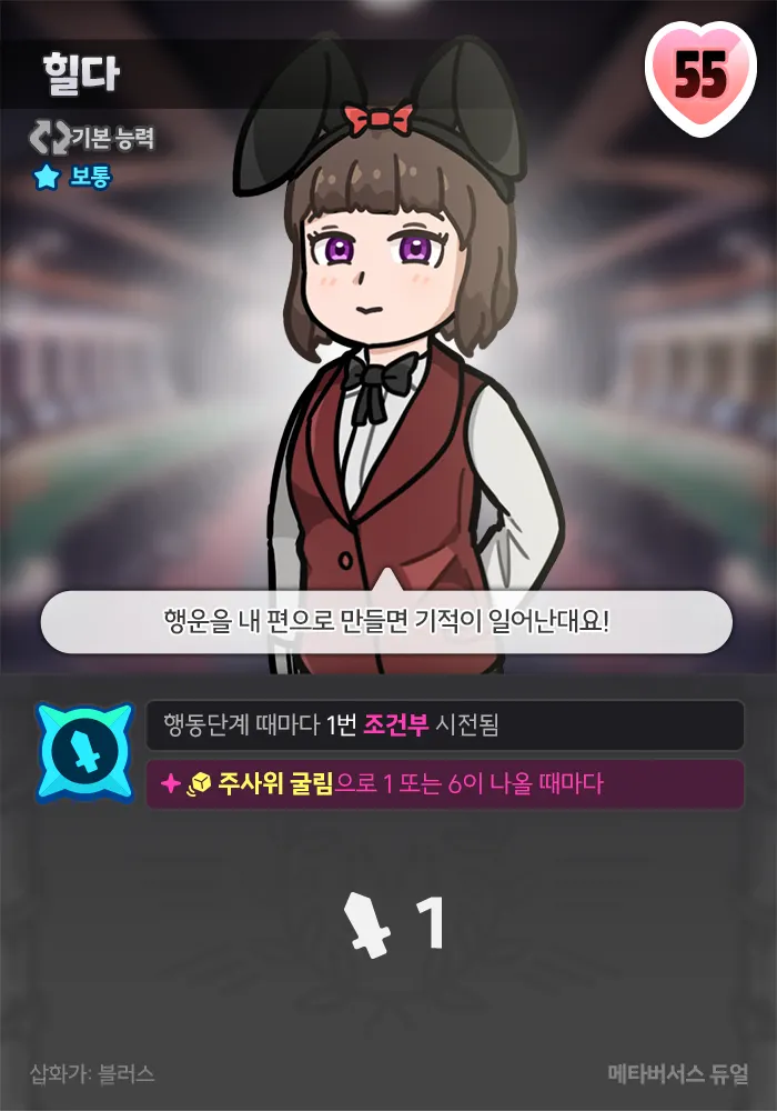 을 한다. 이후 주사위 값만큼 피해를 준다. 1이 나왔다면 추가로 자신은 1 피해를 입는다.