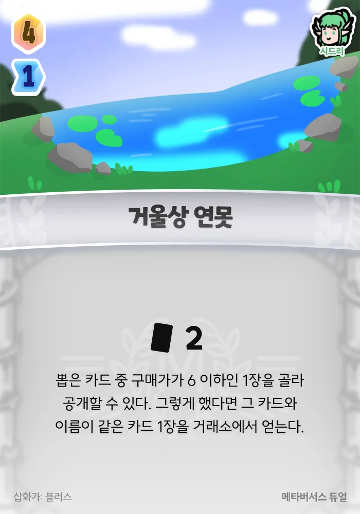 1장을 골라 공개할 수 있다. 그렇게 했다면 그 카드와 이름이 같은 카드 1장을 거래소에서 얻는다.