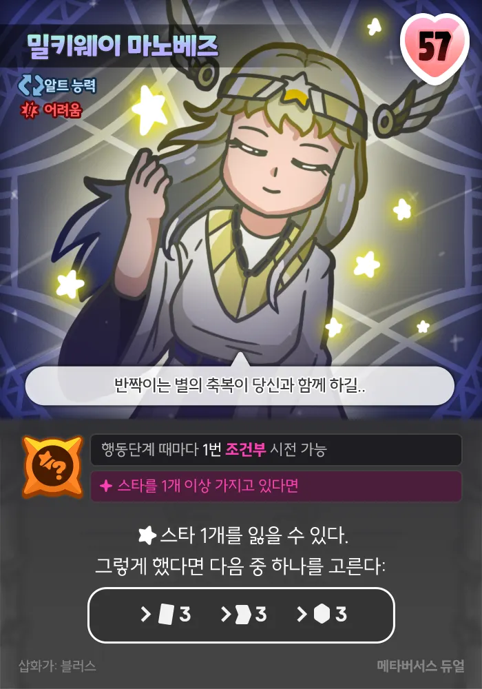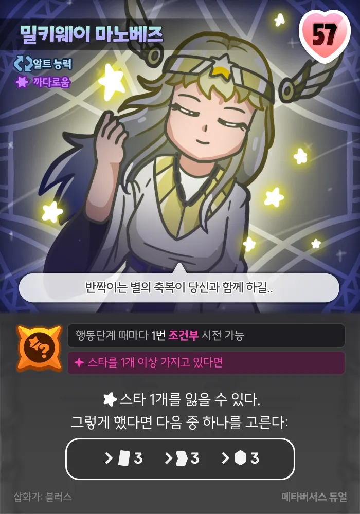 스타를 1개 잃을 수 있다. 그렇게 했다면 다음 중 하나를 고른다: ■ +3 카드 ■ +3 행동력 ■ +3 젬
