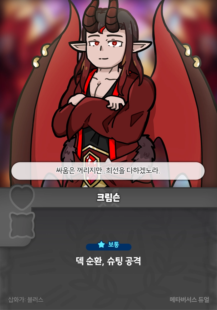 아주 먼 옛날 멸망한 마계의 전직 마왕. 선대 마왕이 사역마로서 전쟁을 위해 자신을 소환해 탄생시켰지만, 모두가 숨을 거두면서 마계에 홀로 남아버렸다. 이러한 일을 겪고 나서인지 겉모습과 다르게 선한 마음을 가진 역설적인 악마가 되어, 막강한 힘을 가졌음에도 직접 싸우지는 않아 왔다. 하지만 더 이상의 쓸모없는 싸움을 보고만 있을 수는 없었는지, 서로를 아꼈으면 하는 소원을 가지며 강림하였다!