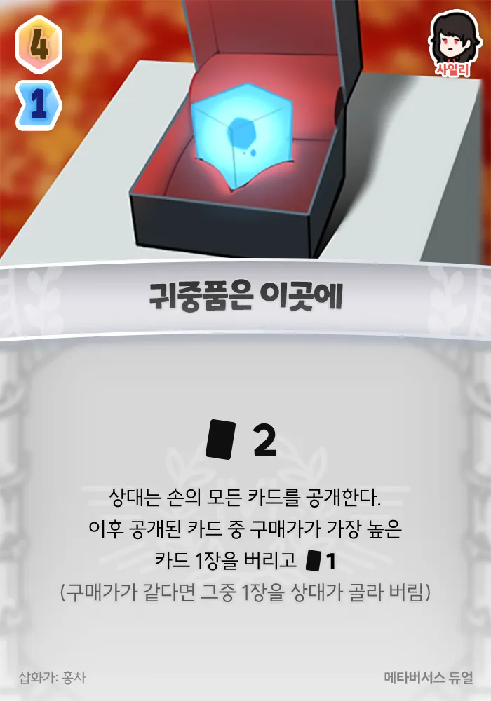 +2 카드, 상대는 손의 모든 카드를 공개한다. 이후 공개된 카드 중 구매가가 가장 높은 카드 1장을 버리고 +1 카드 (구매가가 같다면 그중 1장을 상대가 골라 버림)