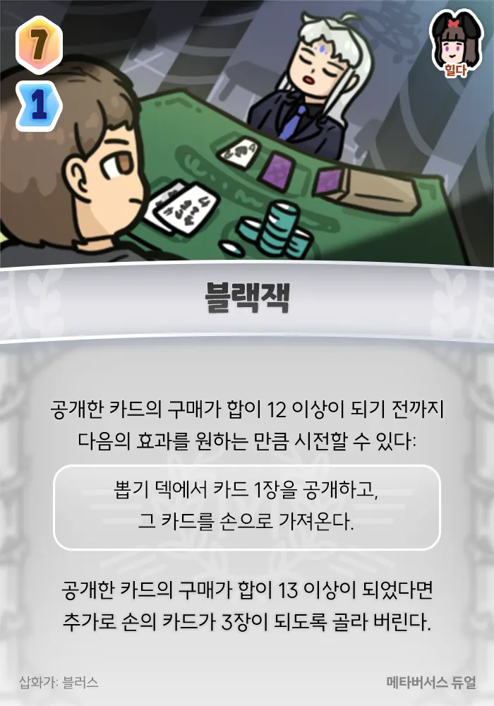 공개한 카드의 구매가 합이 12 이상이 되기 전까지 다음의 효과를 원하는 만큼 시전할 수 있다: [ 뽑기 덱에서 카드 1장을 공개하고, 그 카드를 손으로 가져온다. ] 공개한 카드의 구매가 합이 13 이상이 되었다면 추가로 손의 카드가 3장이 되도록 골라 버린다.
