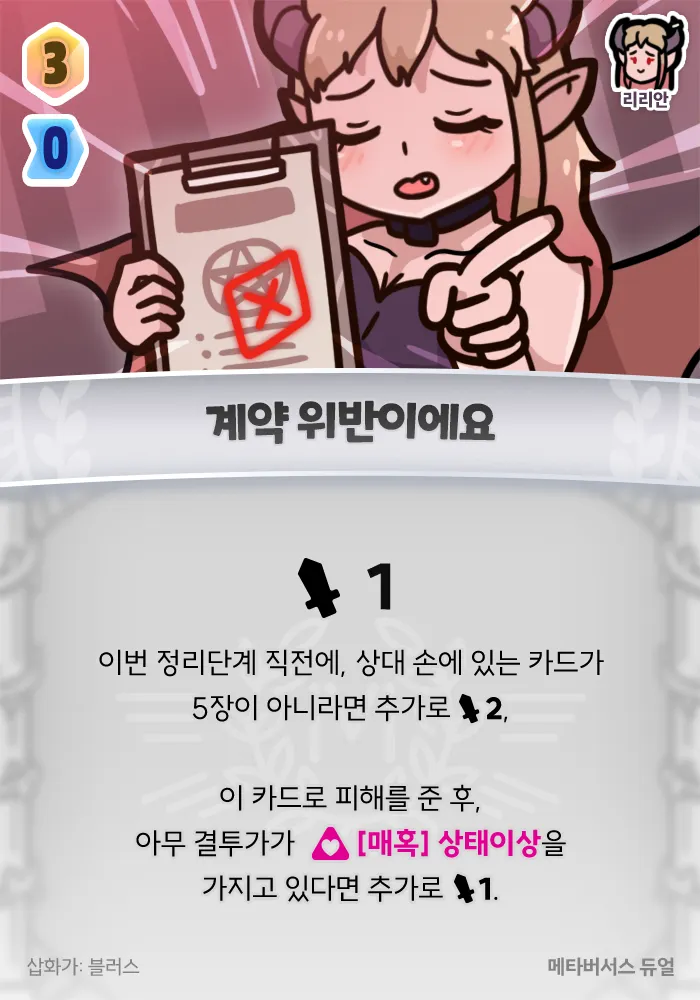 1 피해, 이번 정리단계 직전에, 상대 손에 있는 카드가 5장이 아니라면 추가로 2 피해.