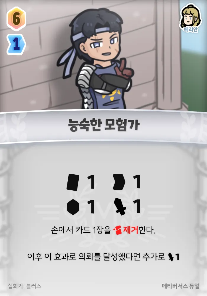 +1 카드, +1 행동력, +1 젬, 1 피해, 손에서 카드 1장을
