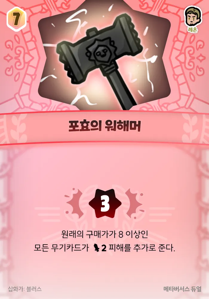 3 피해량, 원래의 구매가가 8 이상인 모든 무기카드가 2 피해를 추가로 준다.