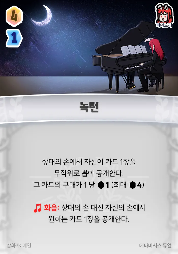 상대의 손에서 자신이 카드 1장을 무작위로 뽑아 공개한다. 그 카드의 구매가 1 당 +1 젬 (최대 4 젬)