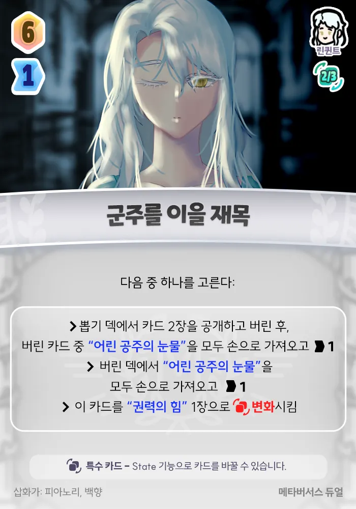 다음 중 하나를 고른다: ■ 뽑기 덱에서 카드 2장을 공개하고 버린 후, 버린 카드 중 “어린 공주의 눈물”을 모두 손으로 가져오고 +1 행동력 ■ 버린 덱에서 “어린 공주의 눈물”을 모두 손으로 가져오고 +1 행동력 ■ 이 카드를 “권력의 힘” 1장으로