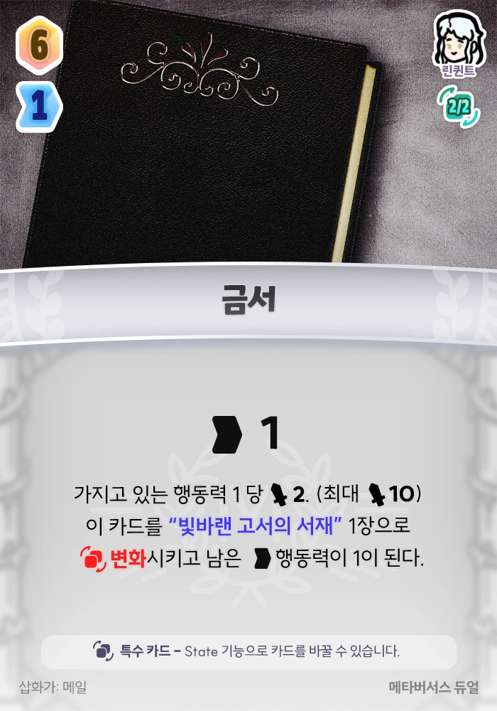 +1 행동력, 가지고 있는 행동력 1 당 2 피해를 준다. (최대 10 피해) 이 카드를 “빛바랜 고서의 서재” 1장으로