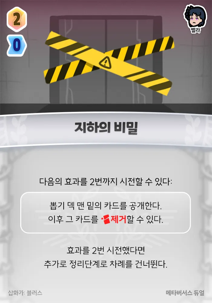 다음의 효과를 2번까지 시전할 수 있다: [뽑기 덱 맨 밑의 카드를 공개한다. 이후 그 카드를