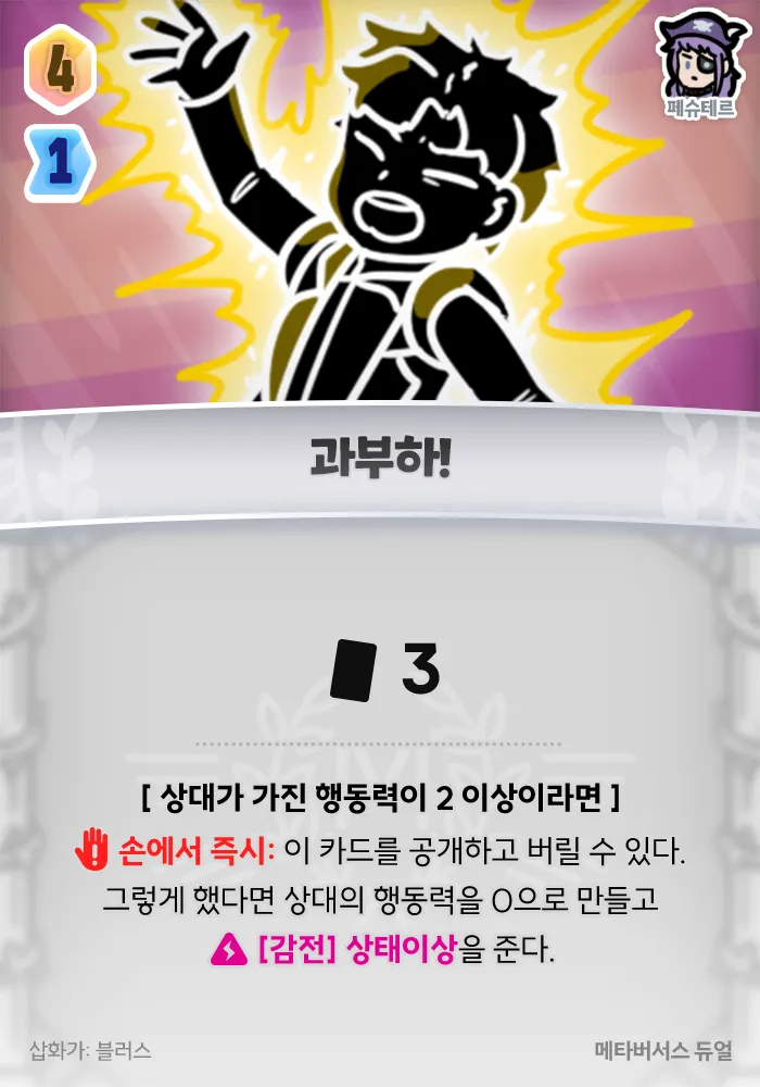 이 카드를 공개하고 버릴 수 있다. 그렇게 했다면 상대의 행동력을 0으로 만들고