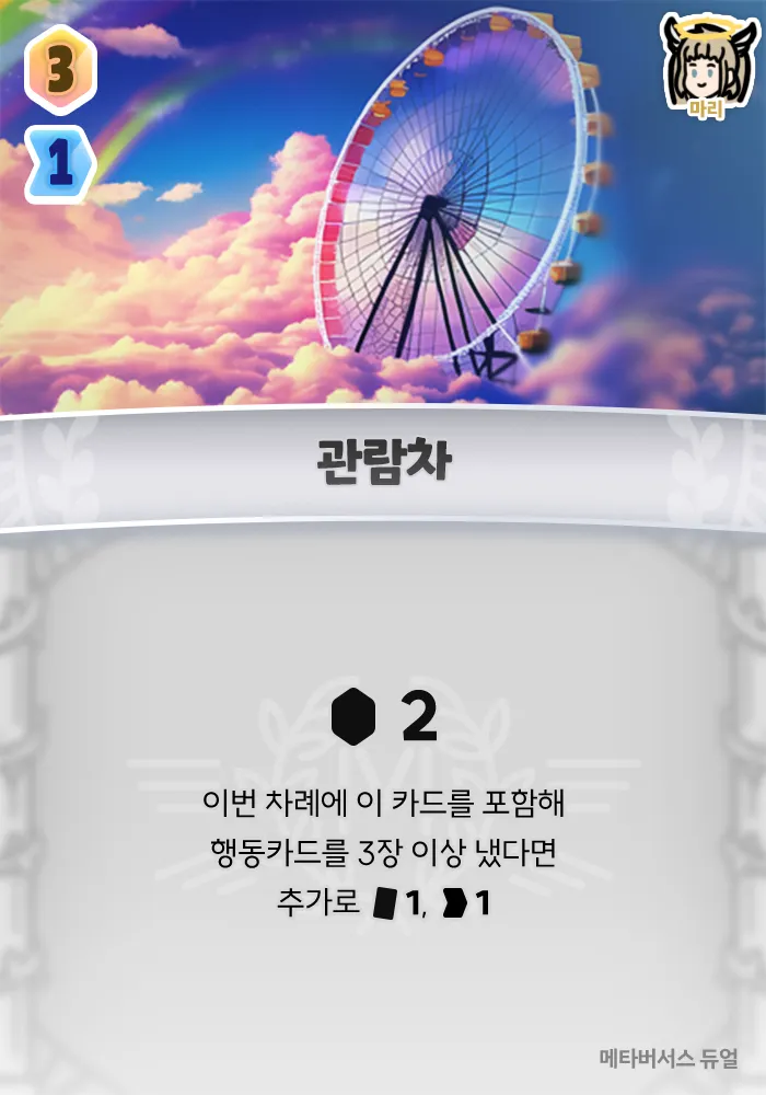 +2 젬, 이번 차례에 이 카드를 포함해 행동카드를 3장 이상 냈다면 추가로 +1 카드, +1 행동력
