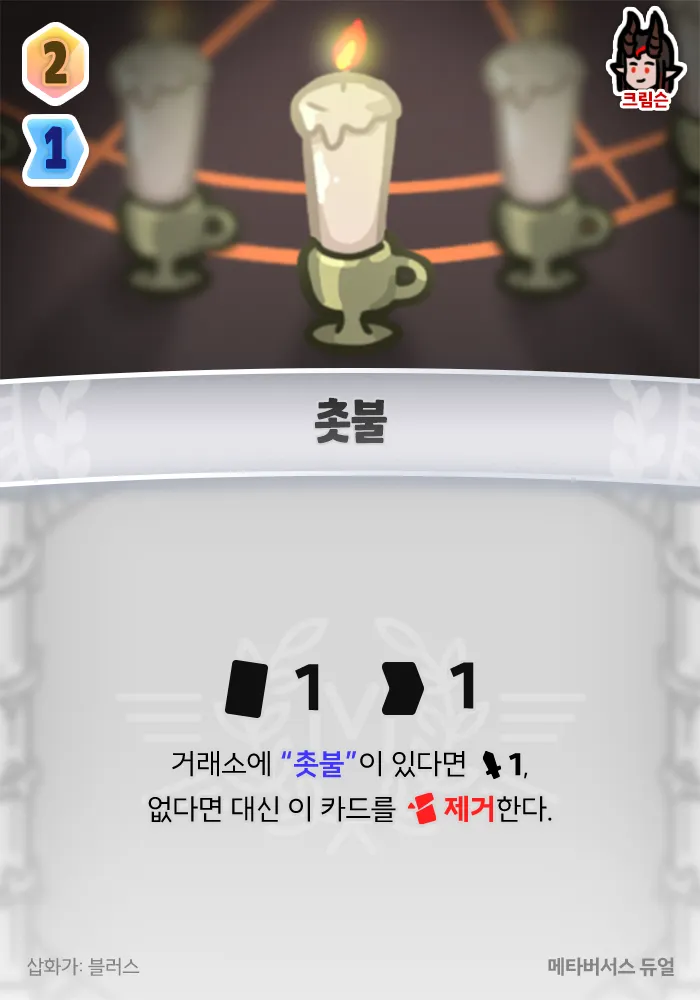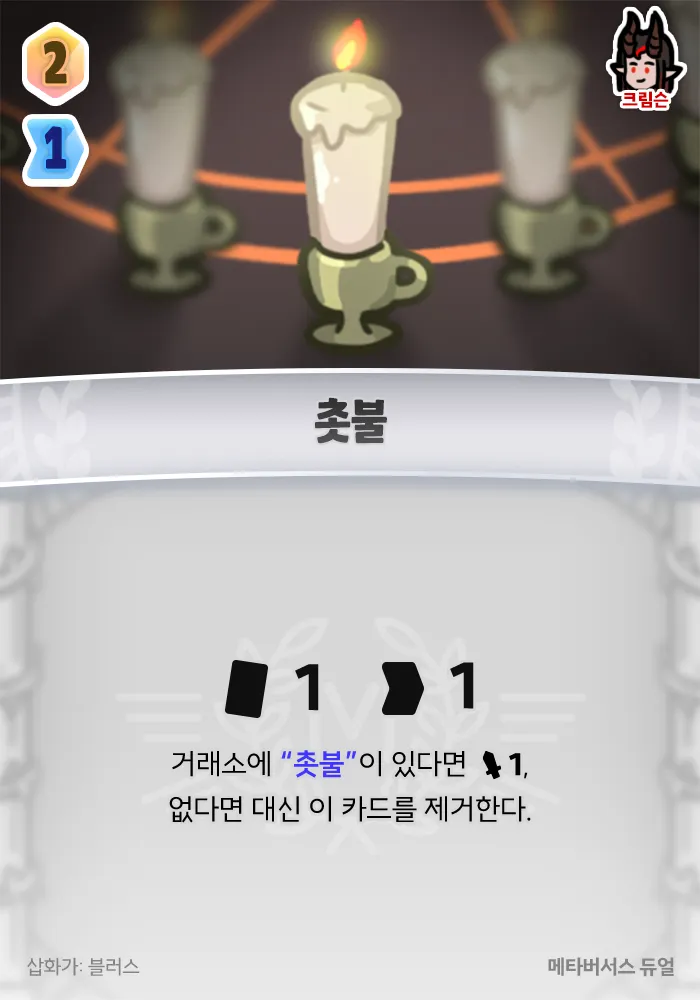 +1 카드, +1 행동력, 거래소에 “촛불”이 있다면 1 피해. 없다면 대신 이 카드를