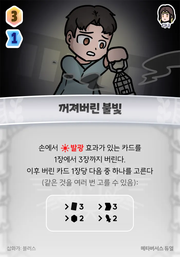 효과가 있는 카드를 1장에서 3장까지 버린다. 이후 버린 카드 1장당 다음 중 하나를 고른다 (같은 것을 여러 번 고를 수 있음): ■ +3 카드 ■ +3 행동력 ■ +2 젬 ■ 2 피해